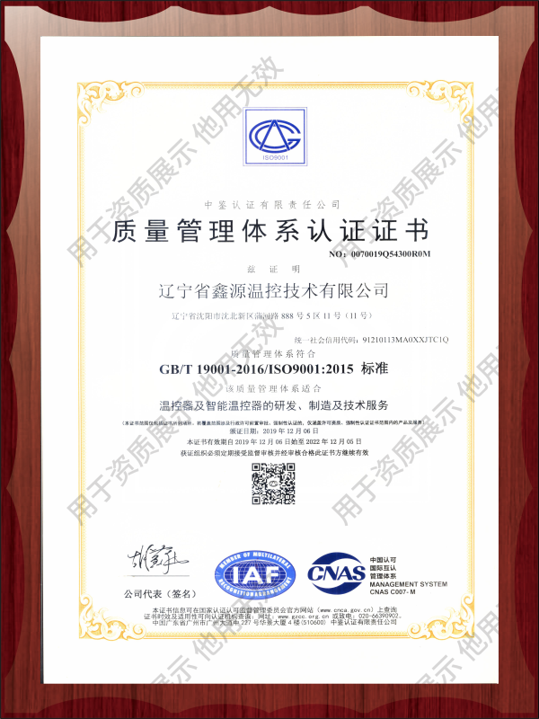 ↑鑫源温控获质量管理体系认证↑